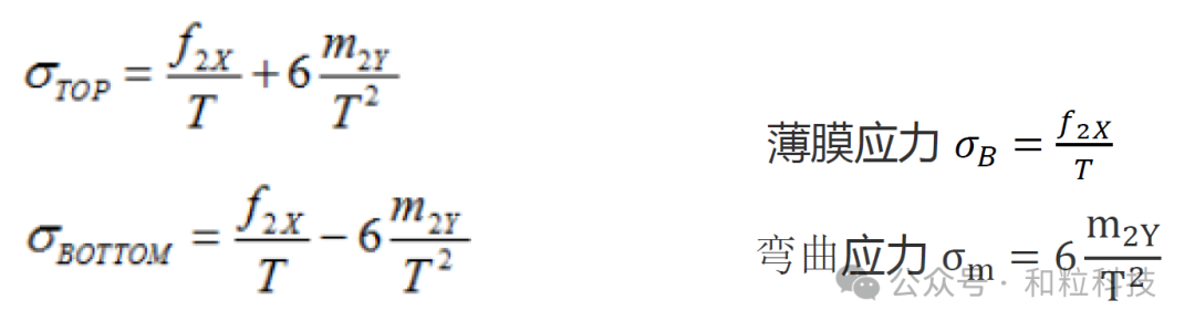 5.将𝑓2、𝑚2沿步骤1中的局部坐标系分解,得到𝑓2𝑋、𝑚2𝑌,通过分解的力计算壳单元上下表面的结构应力𝜎𝑇𝑂𝑃、𝜎𝐵𝑂𝑇𝑇𝑂𝑀