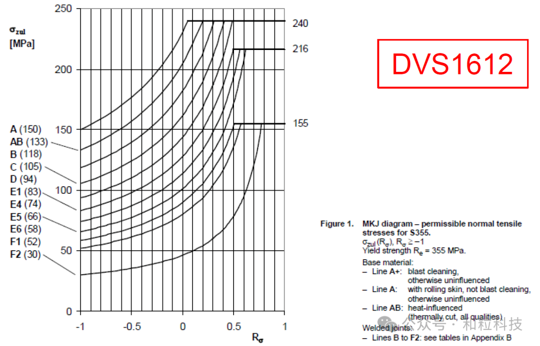 DVS1612规程是《铁路车辆结构焊接接头设计和疲劳强度评估》,DVS1608则对应铝合金材料。DVS 1612 中给出了可允许的最大主应力和剪切应力相对于应力比率R的表。准则中给出了S355 和S235 两种材料的MKJ 图。MKJ图允许的疲劳强度值包括安全因数1.5,因此大约对应于存活概率99.5%,2×106次循环的疲劳强度值。